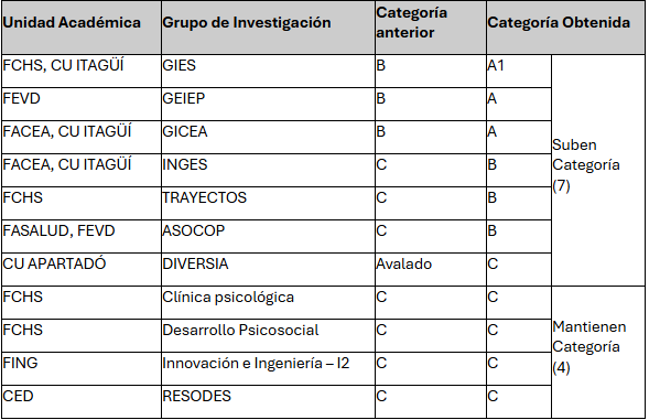 Entre el 18 de junio y 06 de diciembre del año 2024 se realizó la última convocatoria, en la cual UNIMINUTO Rectoría Antioquia - Chocó participó con 11 grupos de investigación, de los cuales 7 lograron subir de categoría y 4 grupos más lograron sostenerla, en la entrega de resultados preliminares.